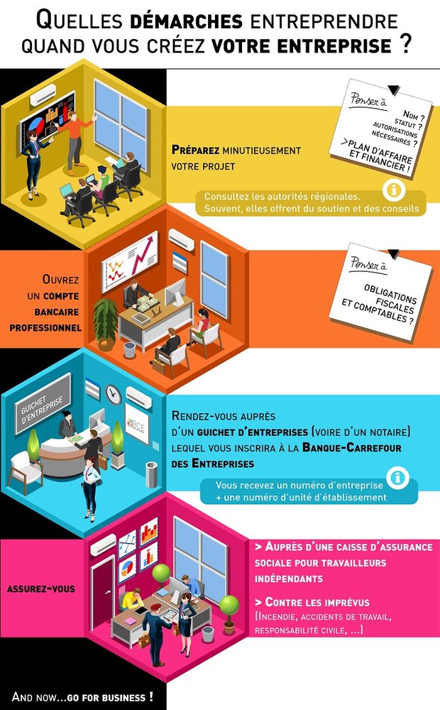 L’idée murie, déterminez si vous souhaitez créer ou reprendre une entreprise ainsi que les produits et services que vous souhaitez proposer. Analysez la concurrence, trouvez un nom, choisissez votre statut juridique (entreprise individuelle ou société), élaborez un business plan et un plan financier et pensez aux conséquences au niveau de votre statut social. Divers organismes publics peuvent vous y aider en Wallonie, en Flandre et à Bruxelles.