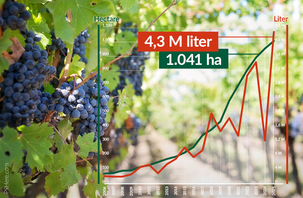 Na de extreem slechte weersomstandigheden in 2024, die de wijnproductie beperkten tot slechts 1,2 miljoen liter, kende de sector in 2025 een opvallend herstel. De oogst bereikte een recordvolume van 4,3 miljoen liter, tegenover 3,4 miljoen liter in 2023, een stijging met 25 %. Dat komt vooral door de zeer goede weersomstandigheden. Daarnaast komt dat jonge wijnstokken in hun eerste jaren nog maar een beperkte opbrengst leveren. Pas na vijf jaar zijn ze matuur genoeg voor een volledige opbrengst. De opbrengst zou dus jaar na jaar moeten stijgen.